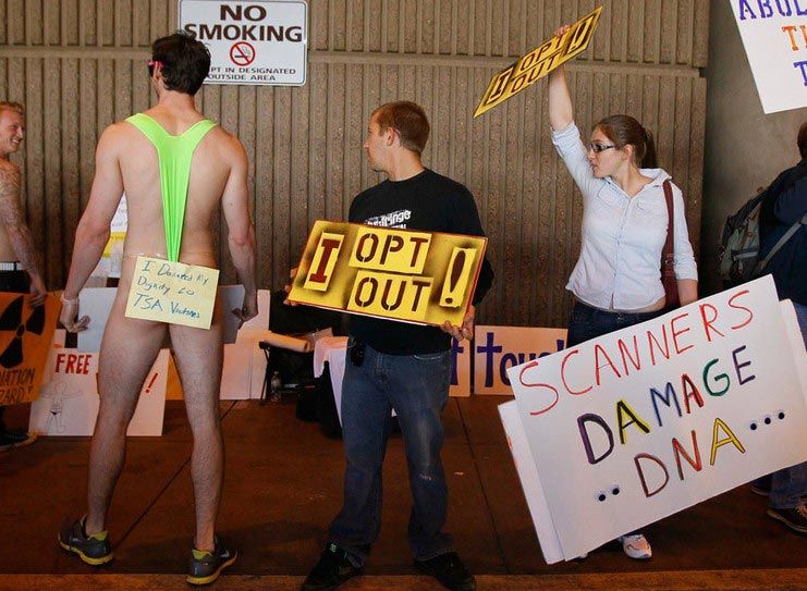 為了保護個人隱私,所有被掃描乘客的面部都進行模糊處理,讓安檢員無法將圖像與個人聯(lián)系起來,而且圖像不會保留在電腦上。但是全身掃描儀器以及搜身檢查的安檢程序仍然在美國朝野引發(fā)了巨大的爭議。令許多民眾無法釋懷的是,盡管運輸安全管理局人員已經(jīng)做出相關保證,但仍然有一些圖像被留存并上傳至網(wǎng)絡。圖為:11月24日,亞利桑那州鳳凰城機場,一些民眾不滿機場的貼身安檢,現(xiàn)場示威抗議。